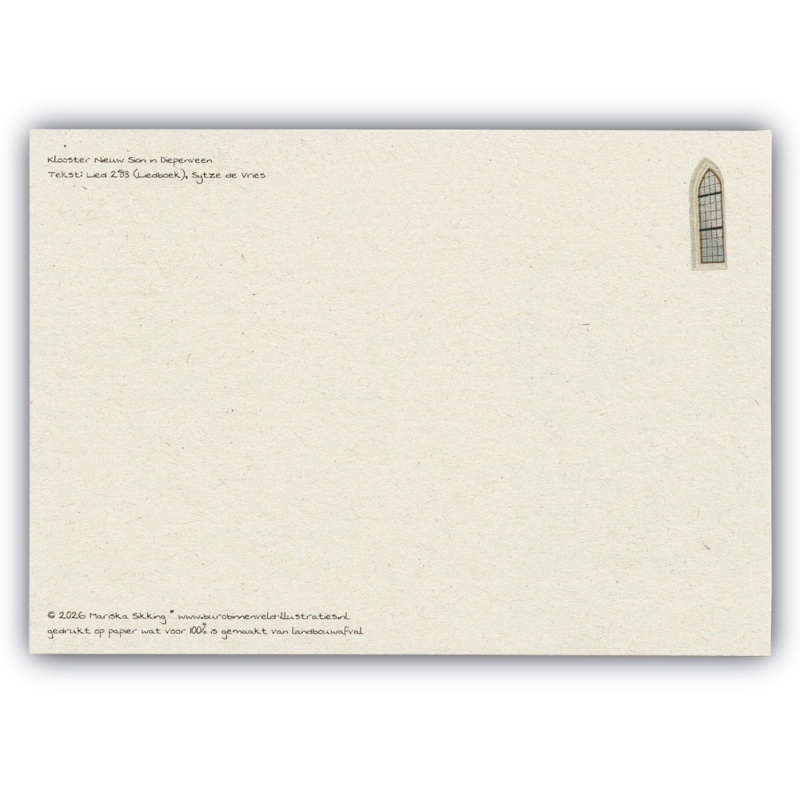 Naar aanleiding van een bezoek aan Klooster Nieuw Sion ontwierp ik deze ansichtkaart. Het is een illustratie van het interieur van de Kloosterkerk. De tekst komt uit lied 283. Dat lied zongen we tijdens het middaggebed in de Kloosterkerk.